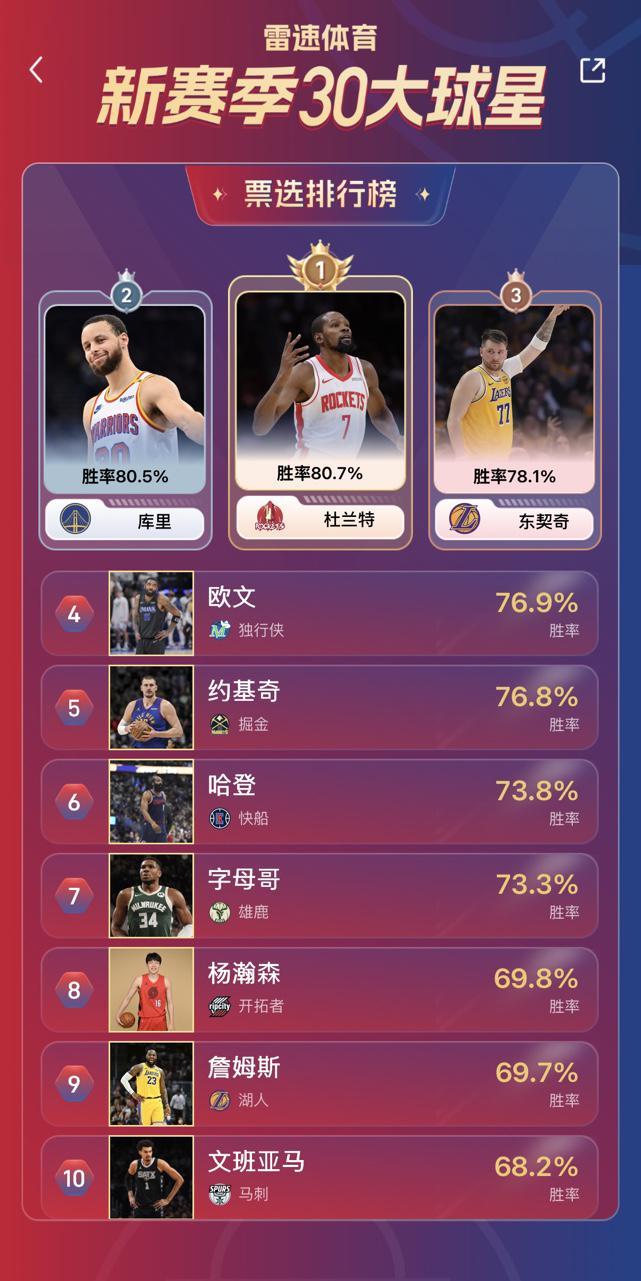 截止至活动首日10月14日的18:00,目前杜兰特、库里、东契奇的胜率最高位列前三,而中国球员杨瀚森也颇受老哥们的青睐,目前位居前十,并且令人惊喜的是,杨瀚森排名第八,力压超级球星勒布朗·詹姆斯。